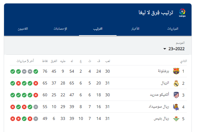 تزايد البحث على مواقع التواصل الاجتماعي حول ترتيب الدوري الاسباني 2022_2023.