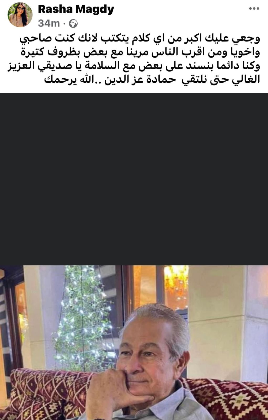 وكانت الإعلامية رشا مجدي، قد نعت الفقيد عبر صفحتها الرسمية عبر موقع فيسوك» قائلة: وجعي عليك أكبر من أي كلام يتكتب لأنك كنت صاحبي وأخويا ومن أقرب الناس مرينا مع بعض بظروف كتيرة وكنا دائما بنسند على بعض مع السلامة يا صديقي العزيز الغالي حتى نلتقي حمادة عز الدين.. الله يرحمك.