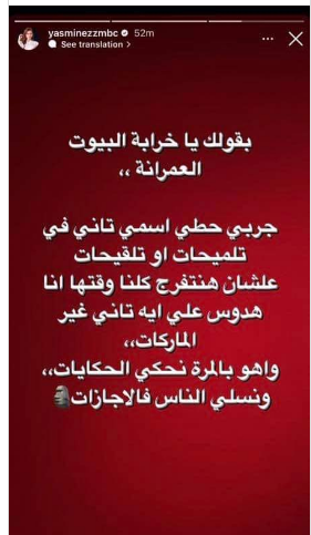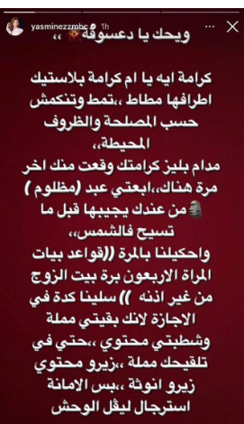 وجاء رد ياسمين عز بعد ذلك على ؛ستوري عبر حسابها الرسمي، وقالت: وكرامة ايه يا ام كرامة بلاستيك أطرافها مطاط، تمط وتنكمش حسب المصلحة والظروف المحيطة.. مدام بليز كرامتك وقعت منك أخى مرة هناك.. ابعتي محد عندك يجيبها قبل ما تسيح فالشمس، واحكيلنا بالمرة قواعد بيات المراة الاربعون برة بيت الزوج من غير اذنه سلينا كدة في الإجازة لانك بقيتب مملة وشطبتي محتوى.. حتى تلقيحك ممل.. زيرو محتوى زيرو انوثة.. بس للأمانة أسترجال ليفل الوحش.