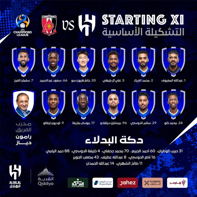 أعلن الأرجنتيني رامون دياز المدير الفني لنادي الهلال السعودي، تشكيل فريقه لمواجهة أوراوا ريد دياموندز الياباني، مساء اليوم السبت، على استاد الملك فهد الدولي بالعاصمة الرياض، في ذهاب نهائي دوري أبطال آسيا.
