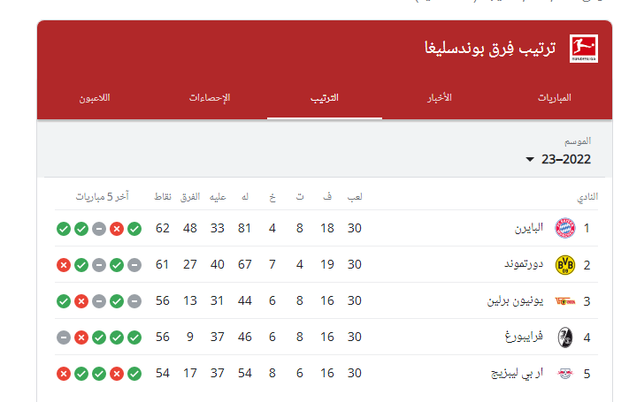 ترتيب الدوري الألماني لكرة القدم 2022_2023.. وموقع بايرن ميونخ