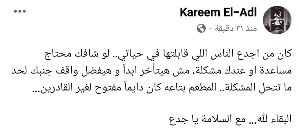 وأضاف كريم العدل عبر فيس بوك: كان من أجدع الناس اللي قابلتها في حياتي، لو شافك محتاج مساعدة أو عندك مشكلة، مش هيتأخر ابدًا وهيفضل واقف جنبك لحد ما تتحل المشكلة، المطعم بتاعه كان دايمًا مفتوح لغير القادرين، البقاء لله، مع السلامة يا جدع".