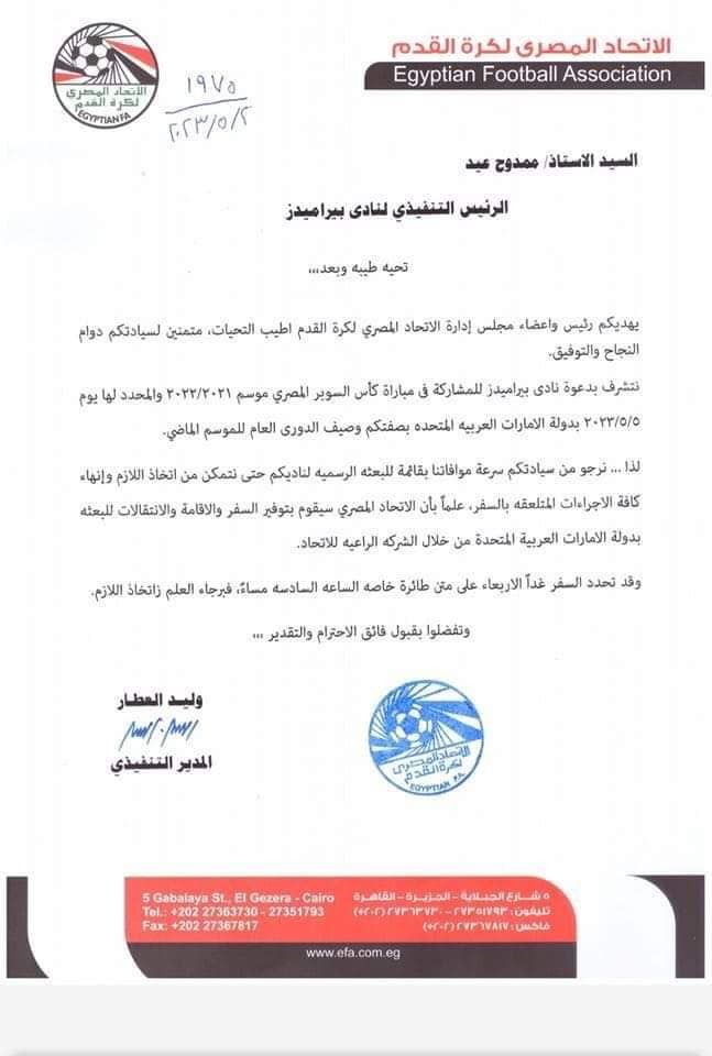 ننشر خطاب اتحاد الكرة إلى بيراميدز لمواجهة الأهلي في السوبر المصري