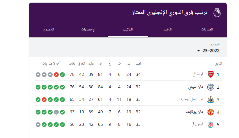 بعد مبارة آرسنال ضد تشيلسي.. ترتيب الدوري الإنجليزي لموسم 2022-2023