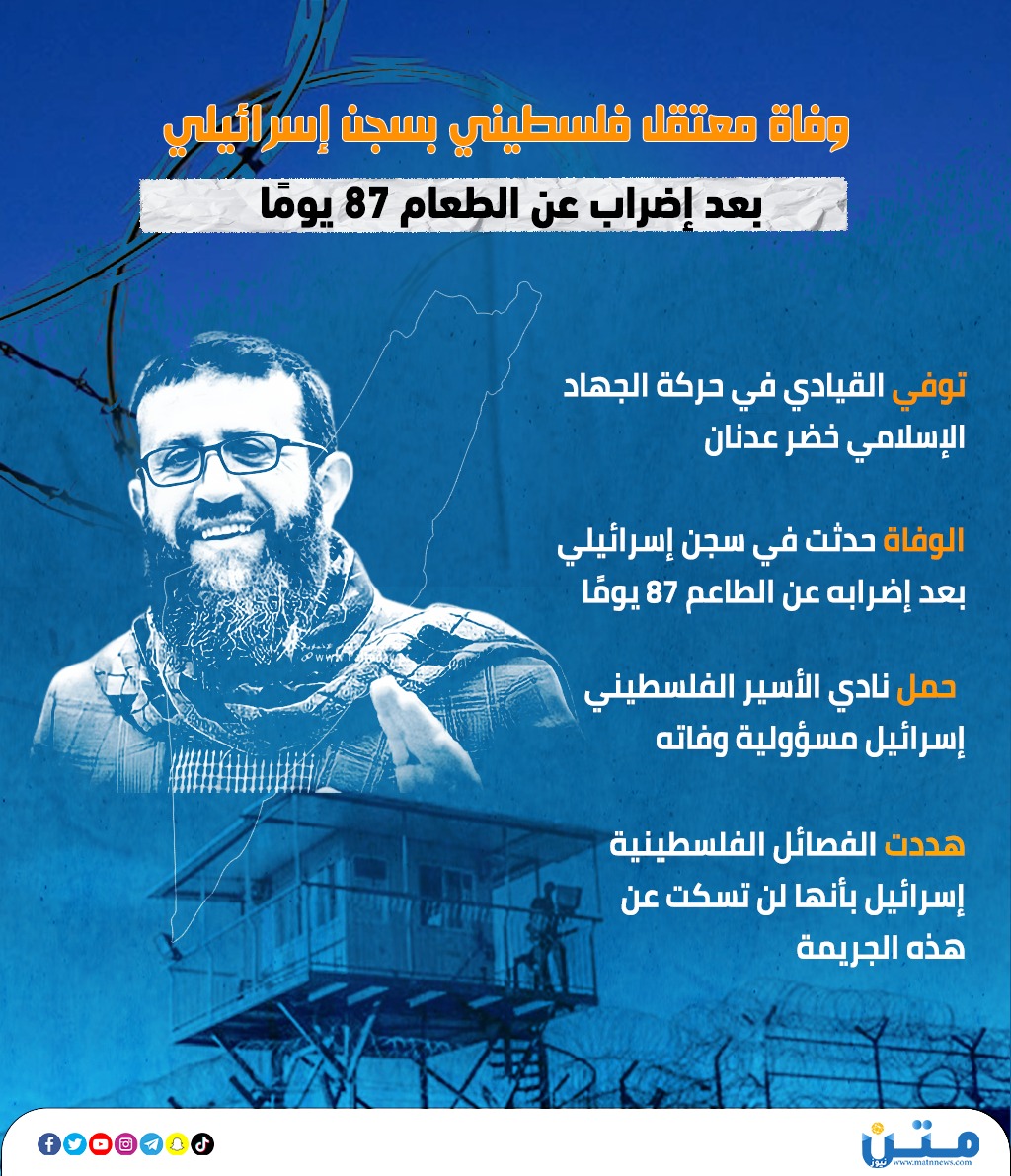 وفاة معتقل فلسطيني بسجن إسرائيلي بعد إضراب عن الطعام 87 يومًا (إنفوجراف)