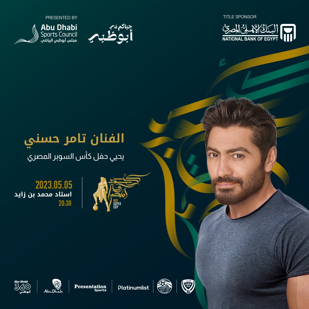 وقال مجلس أبوظبي الرياضي في بيان عبر حسابه على "تويتر": "سيكون جمهور كأس السوبر المصري على موعد مع الحفل الذي يحييه الفنان تامر حسني، كونو على الموعد".