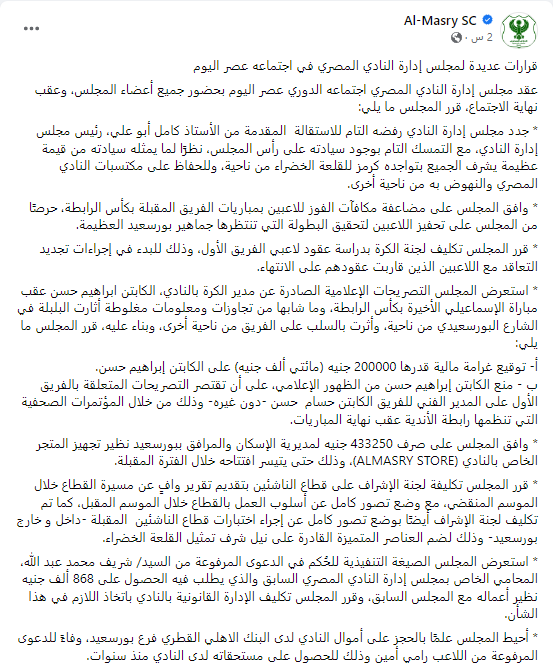 - استعرض المجلس التصريحات الإعلامية الصادرة عن مدير الكرة بالنادي، الكابتن إبراهيم حسن عقب مباراة الإسماعيلي الأخيرة بكأس الرابطة، وما شابها من تجاوزات ومعلومات مغلوطة أثارت البلبلة في الشارع البورسعيدي من ناحية، وأثرت بالسلب على الفريق من ناحية أخرى وبناء عليه قرر المجلس ما يلي: