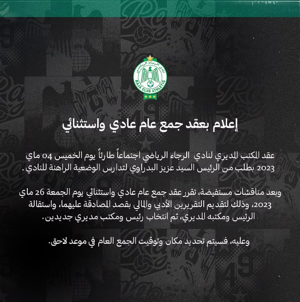 ونشر نادي الرجاء بيانًا رسميًا مساء الخميس، على صفحاته الرسمية بمنصات التواصل الاجتماعي، أعلن من خلاله عقد اجتماع استثنائي، في 26 مايو الجاري، لتقديم التقريرين الأدبي والمالي، بقصد المصادقة عليهما.