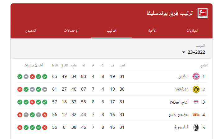 بايرن ميونخ يرفع رصيده للنقطة 65 في صدارة ترتيب الدوري الألماني 2022_ 2023