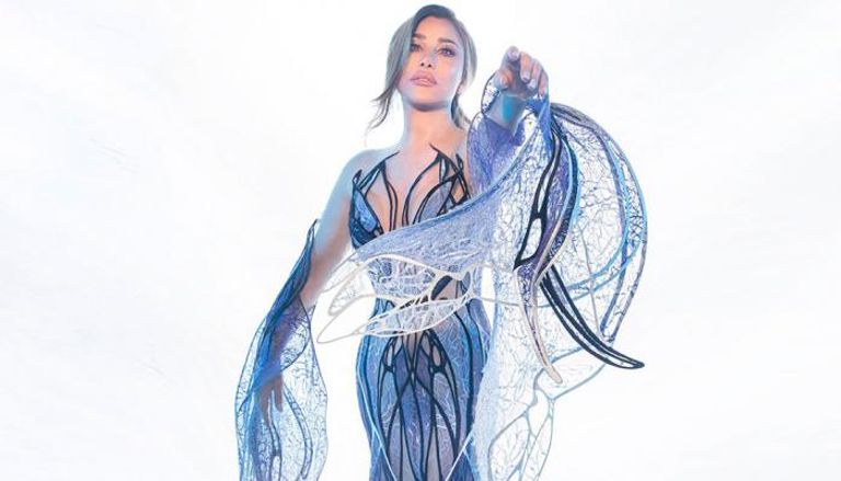 وظهرت على الملصق الدعائي وهي ترتدي فستانا أزرق اللون من تصميم "إيريس فان هيرين"، وفكرة الفستان مستوحاة من أجواء اليونان القديمة والأساطير، وينتمي الفستان إلى أزياء شتاء وخريف 2022.