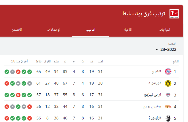 تزايد البحث على مواقع التواصل الاجتماعي خلال الساعات الماضية حول ترتيب الدوري الألماني بعد فوز بايرن ميونخ على حساب فيردر بريمن السبت.