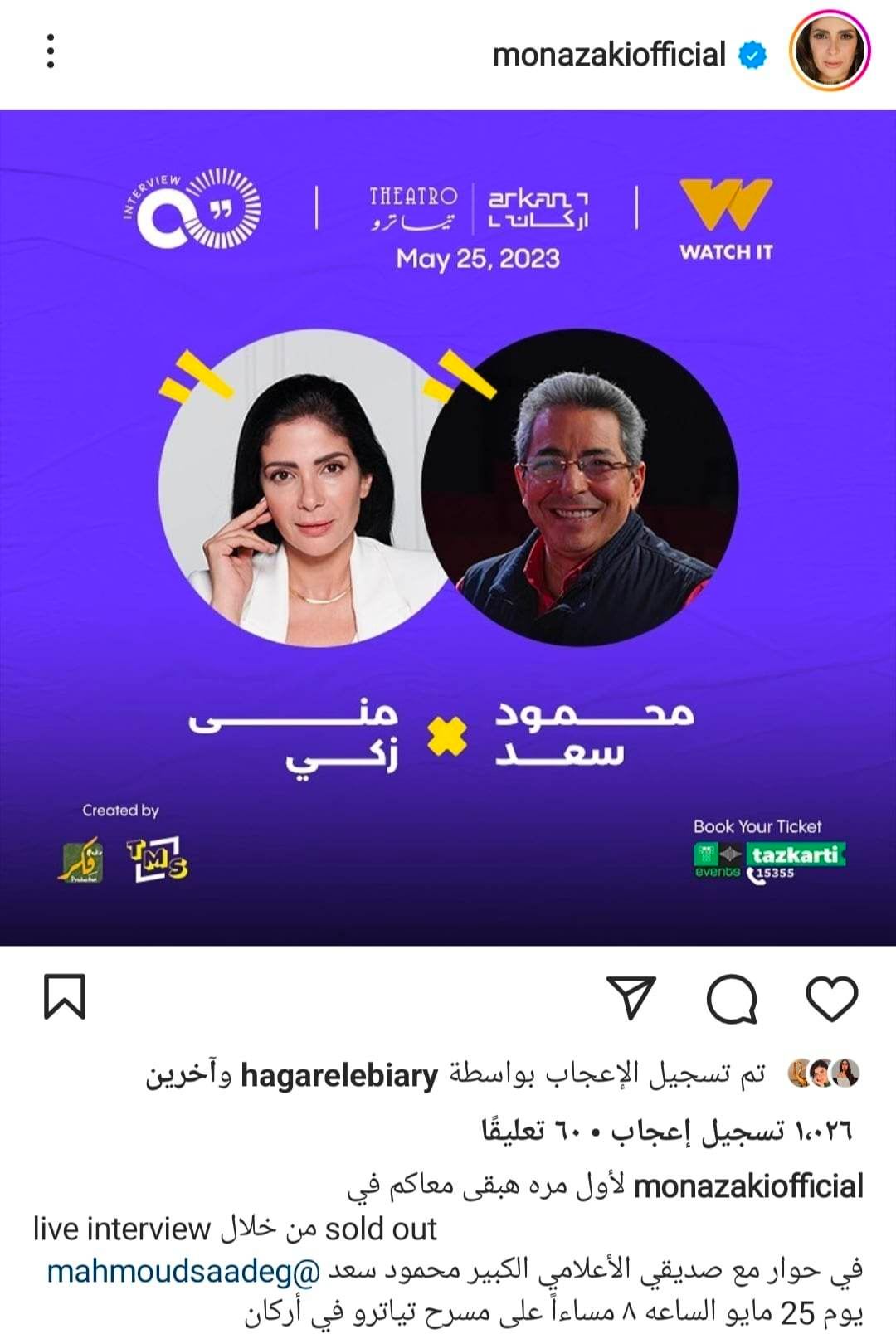 ونشرت منى ذكي عبر صفحتها الشخصية على موقع انستجرام، صورة للإعلان عن المقابلة، وعلقت قائلة: "لأول مرة هبقى معاكم في لايف انترفيو، من خلال sold out، في حوار مع صديقي الإعلامي الكبير محمود سعد، يوم 25 مايو الساعة 8 مساء، على مسرح تياترو في أركان".