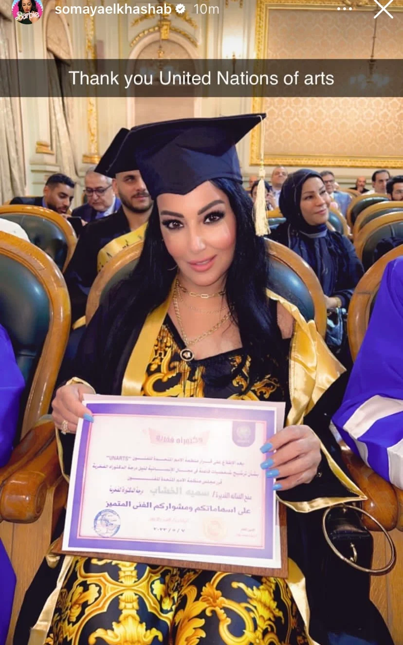 أولى الصور لـ" سمية الخشاب" بعدما منحتها منظمة الأمم المتحدة للفنون الدكتوراه الفخرية (أبرز تصريحاتها)