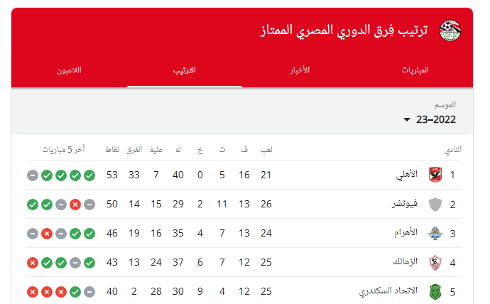 المارد الاحمر يتصدر.. جدول ترتيب الدوري المصري 2022_2023