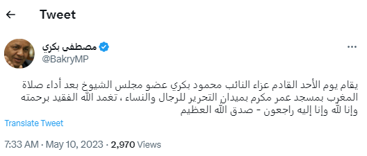 أعلن الكاتب الصحفي المصري مصطفى بكرى، إقامة عزاء شقيقه النائب محمود بكرى، عضو مجلس الشيوخ، عقب أداء صلاة المغرب، يوم الأحد المقبل بمسجد عمر مكرم بميدان التحرير.