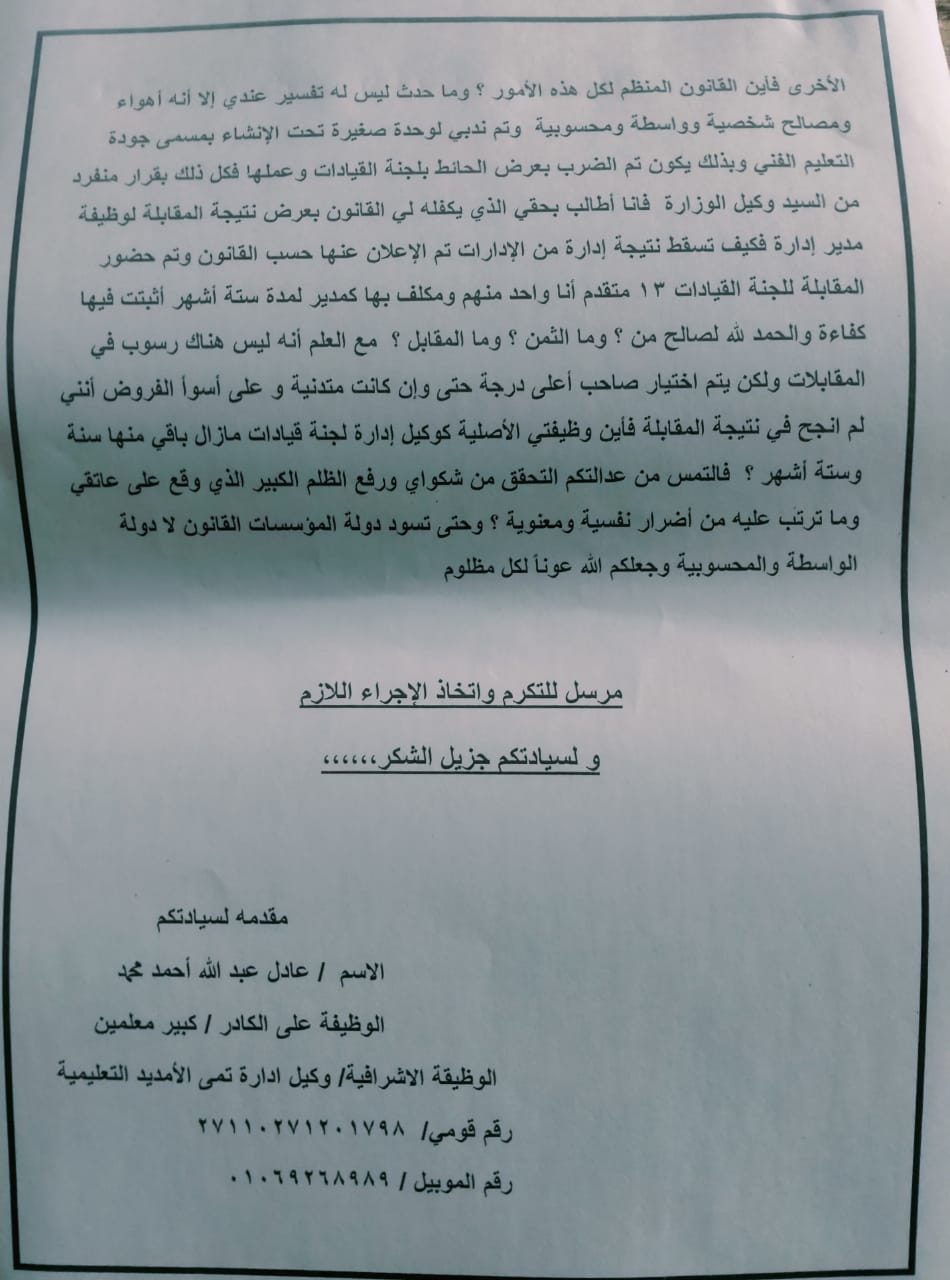 وأكد في شكواه التي رفعها إلى وزير التربية والتعليم أنه تم ندبه إلى وحدة صغيرة تحت الإنشاء بمسمى جودة التعليم الفني، بقرار منفرد، مطالبًا بحقه الذي يكفله له القانون بعرض نتيجة المقابلة التي أجراها لوظيفة مدير إدارة بعد أن أثبت كفائته في تلك المقابلات ولم يثبت رسوبه في أي مقابلة.