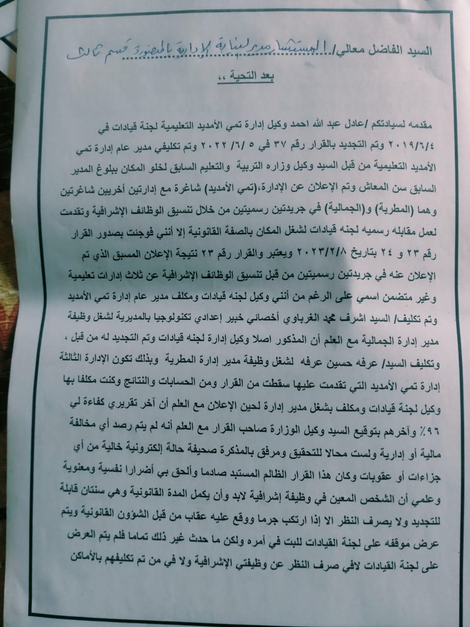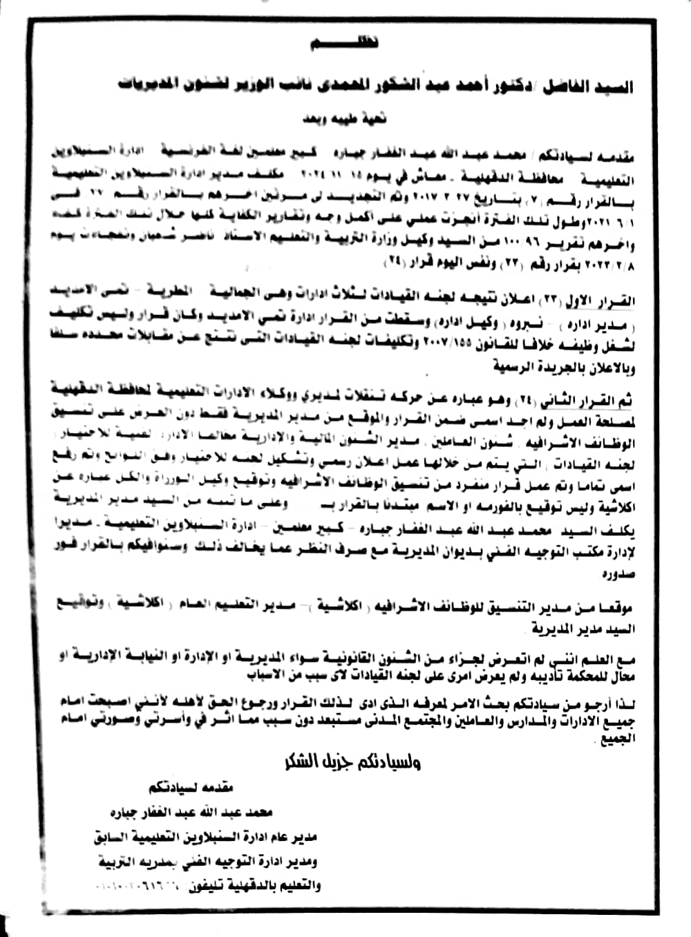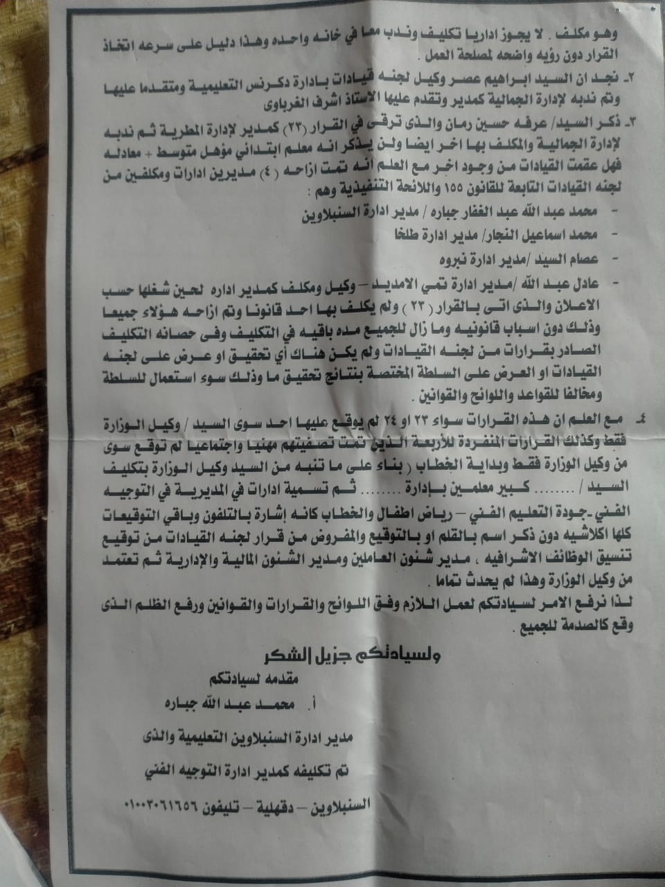 فيما أكد محمد عبد الله جبارة، كبير معلمي اللغة الفرنسية بتمى الأمديد بمحافظة الدقهلية، إنه فوجئ بقرارين من مدير المديرية الأول بشغل وظيفة خلافًا للقانون رقم 155 لسنة 2007، والقرار الثاني تعمد حذف اسمه من حركة تنقلات مديري ووكلاء الإدارات التعليمية بمحافظة الدقهلية وتكليفه مديرًا لإدارة مكتب الوجيه الفني بديوان المديرية، مطالبًا في الوقت ذاته برجوع الحق لأهله، بسبب استبعاده دون سبب من وظيفته الأصلية كمدير عام لإدارة السنبلاوين التعليمية.