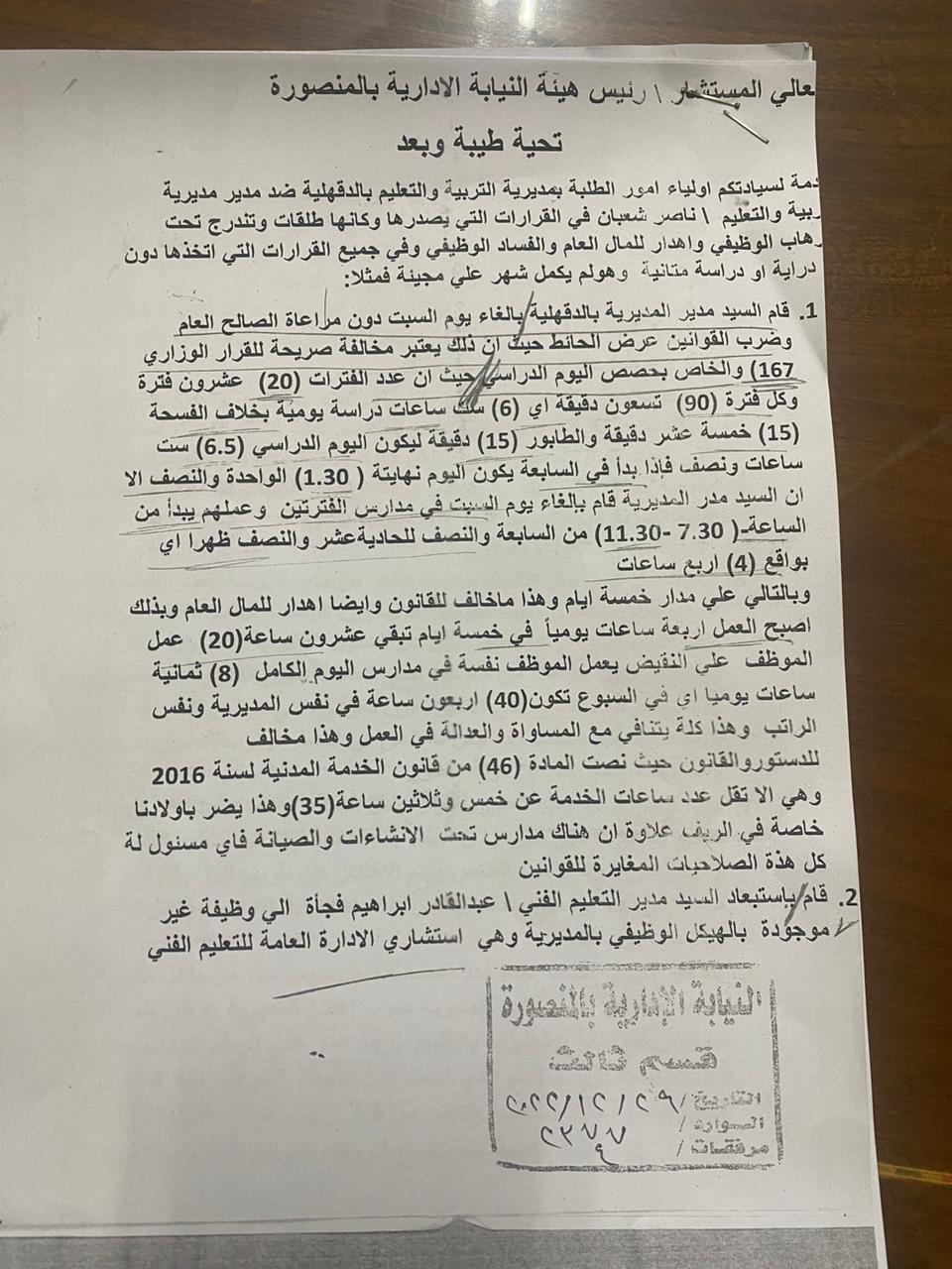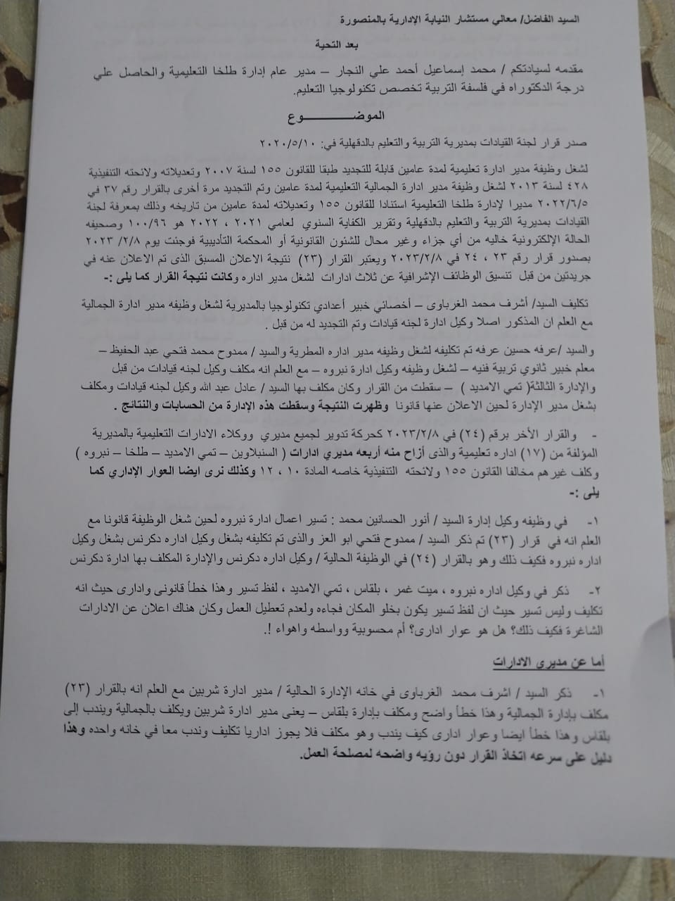 كما تقدم الدكتور محمد إسماعيل النجار، مدير عام إدارة طلخا التعليمية بالدقهلية بشكوى إلى هيئة النيابة الإدارية بالمنصورة يشكو فيها من قرارات لجنة القيادات بمديرية التربية والتعليم، والتي تتعمد إصدار قرارات التعيين والندب في خانة واحدة كدليل على سرعة اتخاذ تلك القرارات دون رؤية واضحة لمصلحة العمل، وهذا على حد تعبيره.