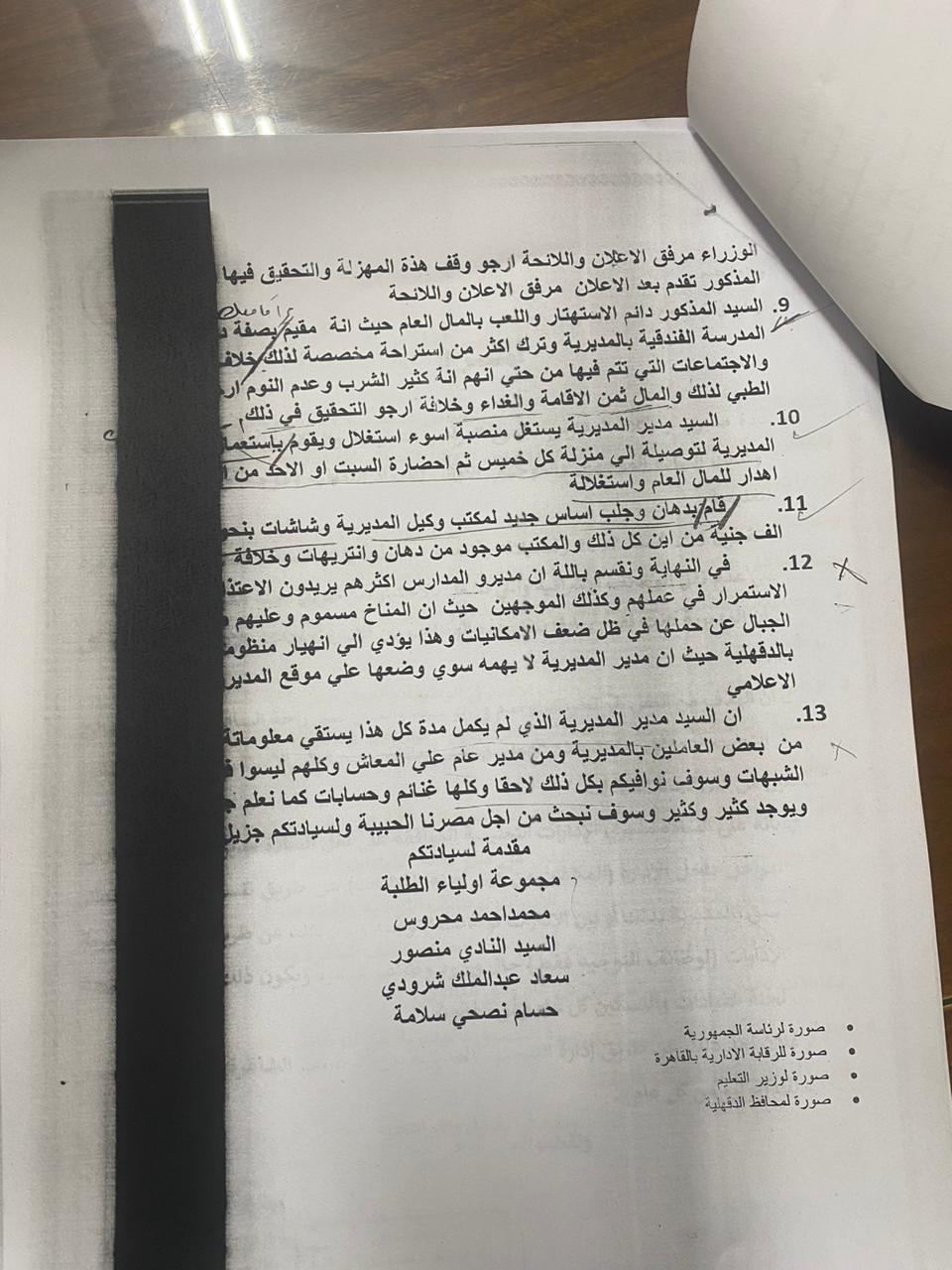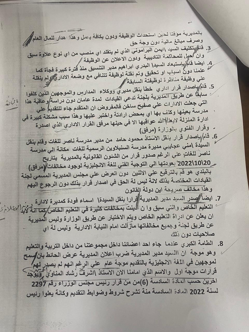 وذكرت الشكاوى أن "ن – ش" يتعمد انتقاء من يضع أسمائهم في نشرات النقل في أماكن يطلبونها، في الوقت الذي يتعمد فيه نقل بقية الموظفين ممن لم يستجيبوا لضغوطه إلى أماكن بعيدة عن مساكنهم أو تقليل وضعهم الوظيفي.