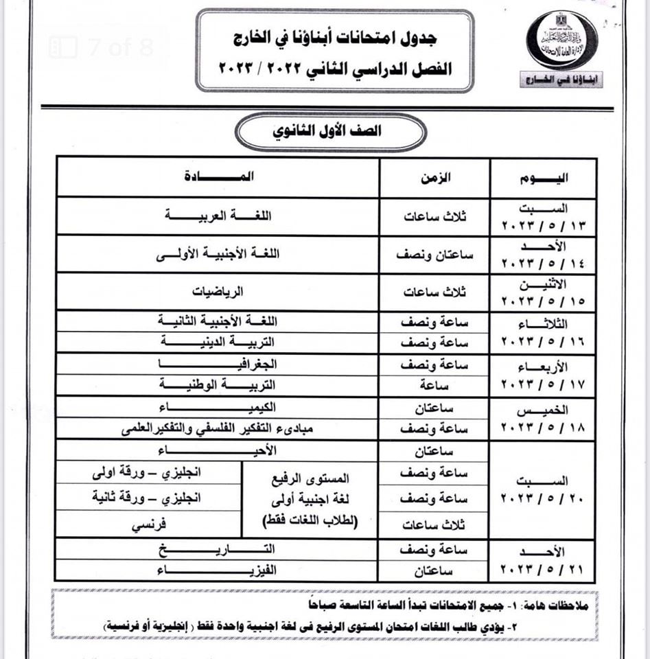 جدول امتحانات الصف الأول الثانوي للمصريين بالخارج