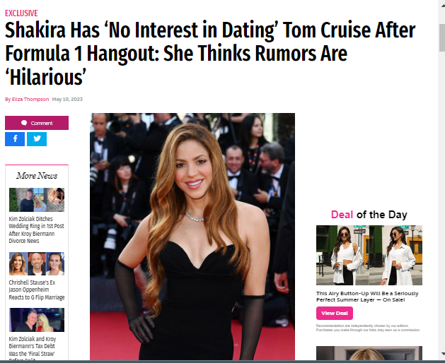 وفي أول رد فعل رسمي من شاكيرا أعلنت نفيها وجود أي علاقة بينها وبين النجم العالمي توم كروز، بعد ظهورهما معا فى F1 Miami Grand Prix 2023، حيث التقطت عدسات المصورين عدة صور للثنائي معًا فى سباق الجائزة الكبرى لـ "فورمولا 1"، فى ميامى خلال عطلة نهاية الأسبوع.