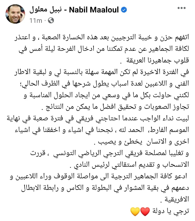 ونشر نبيل معلول بيانًا عبر حسابه الشخصي على موقع التواصل الاجتماعي "فيسبوك"، أعلن من خلاله استقالته من منصبه كمدرب للترجي التونسي: أتفهم حزن وخيبة الترجيين بعد هذه الخسارة الصعبة، واعتذر لكافة الجماهير عن عدم تمكننا من إدخال الفرحة ليلة أمس في قلوب جماهيرنا العريقة.