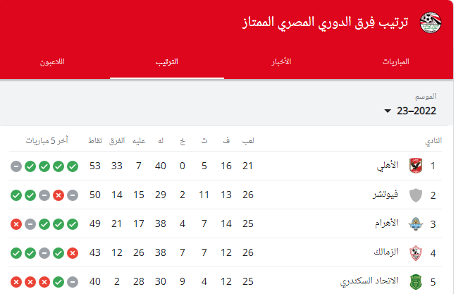 بعد الإسماعيلي ضد الزمالك.. ما هو ترتيب الدوري المصري الممتاز؟