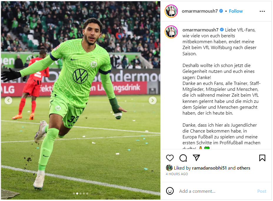 ونشر عمر مرموش، عبر حسابه الرسمي على موقع التواصل الاجتماعي "انستجرام"، صورة بقميص فريق فولفسبورج، وعلق قائلا: "عشاق فولفسبورج الأعزاء، كما لاحظ الكثير منكم، ينتهي وقتي في فولفسبورج بعد هذا الموسم، ولهذا السبب أردت أن أغتنم الفرصة الآن وأخبركم بشيء واحد شكرا لكم".