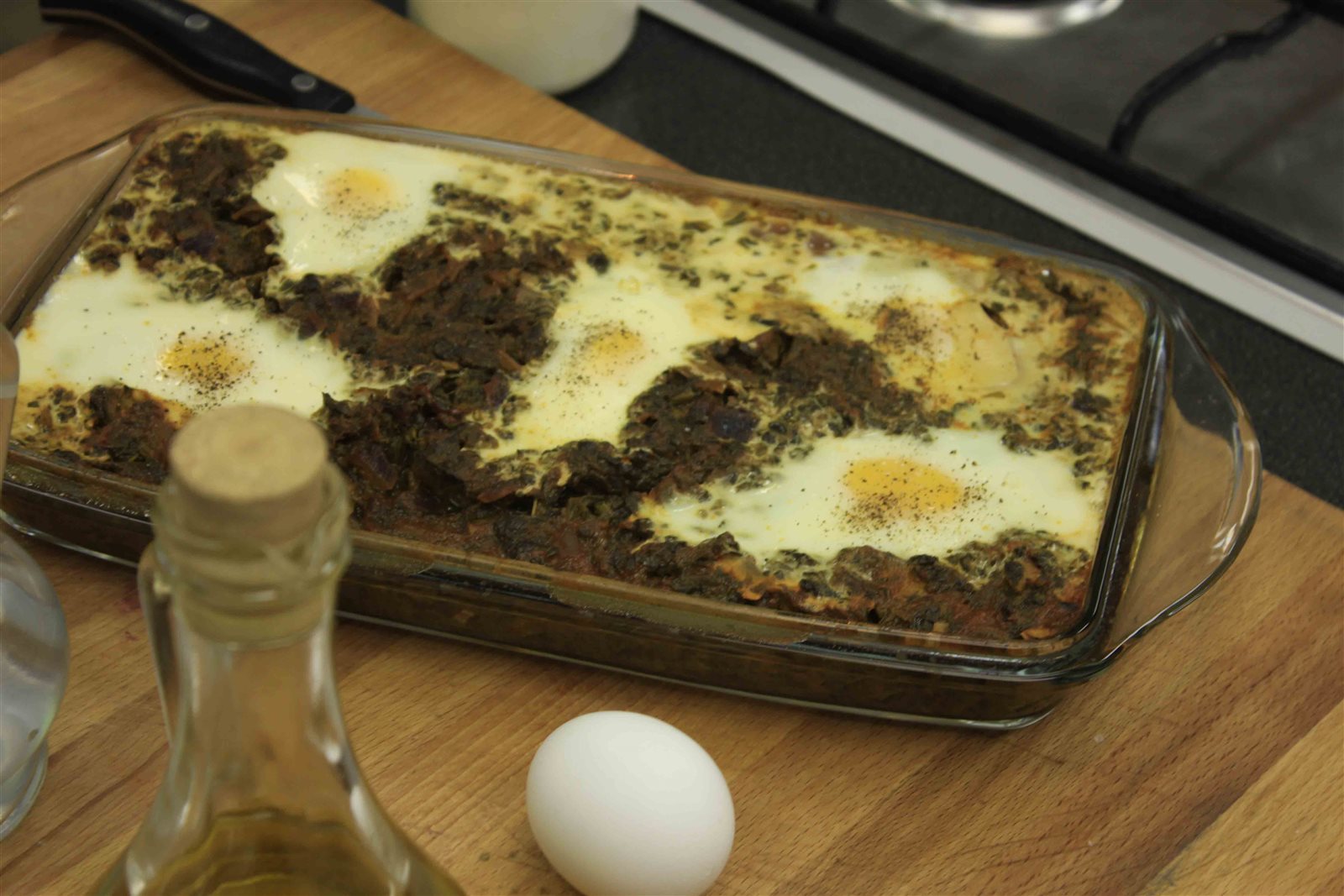 - قلبي السبانخ لمدة 5 دقائق ثم ضعي البيض على شكل بيض عيون على سطح الطاجن.
