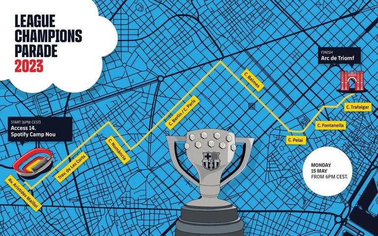 ويمتد الموكب الاحتفالي إلى 8 كيلومترات، بدءا من ملعب "كامب نو"، مرورا بالعديد من المحطات في الطريق، قبل الوصول في النهاية إلى النصب التذكاري "قوس النصر".