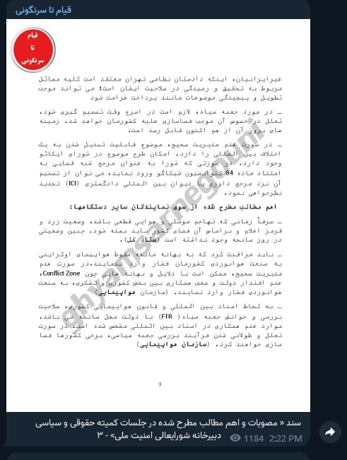 وعرضت قناة” الانتفاضة حتى اسقاط النظام”، عن العديد من الوثائق المهمة، بما في ذلك تلك المتعلقة بإسقاط الطائرة الاوكرانية التي من قبل قوات الحرس في سماء طهران في يناير 2020 والمعروف بالرحلة PS752.