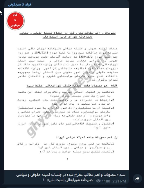 تشير الوثيقة الأولى إلى اجتماع المجلس الأعلى للأمن القومي في 21 يناير. وبحسب هذه الوثيقة، عقدت “جلسات اللجان القانونية والسياسية للمجلس الوطني الأعلى يومي الثلاثاء 21 يناير 2020 والأربعاء 22 يناير 2020 بعد الظهر. ترأس الجلسات السيد علوي، القائم بأعمال النائب القانوني، وإيرواني، نائب رئيس السياسة الخارجية والأمن الدولي في المجلس الأعلى للأمن القومي، فضلا عن ممثلي الوزارة المعنية، هيئة الأركان العامة للقوات المسلحة، السلطة القضائية، مكتب المدعي العام، وزارة الاستخبارات، النائب القانوني والمركز القانوني لمكتب الرئيس، وجامعة الدفاع الوطني، والطيران الوطني في البلاد، والمدعي العام العسكري في طهران”.