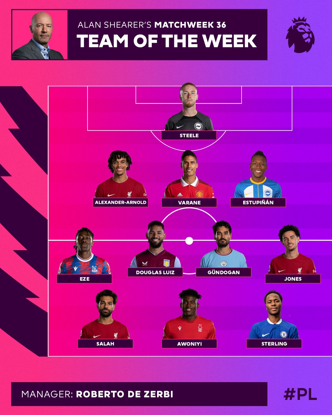 ونشر الحساب الرسمي للبريمرليج على موقع التواصل الاجتماعي "تويتر"، التشكيل المثالي للجولة 36 من الدوري الإنجليزي حسب اختيارات الأسطورة آلان شيرار.