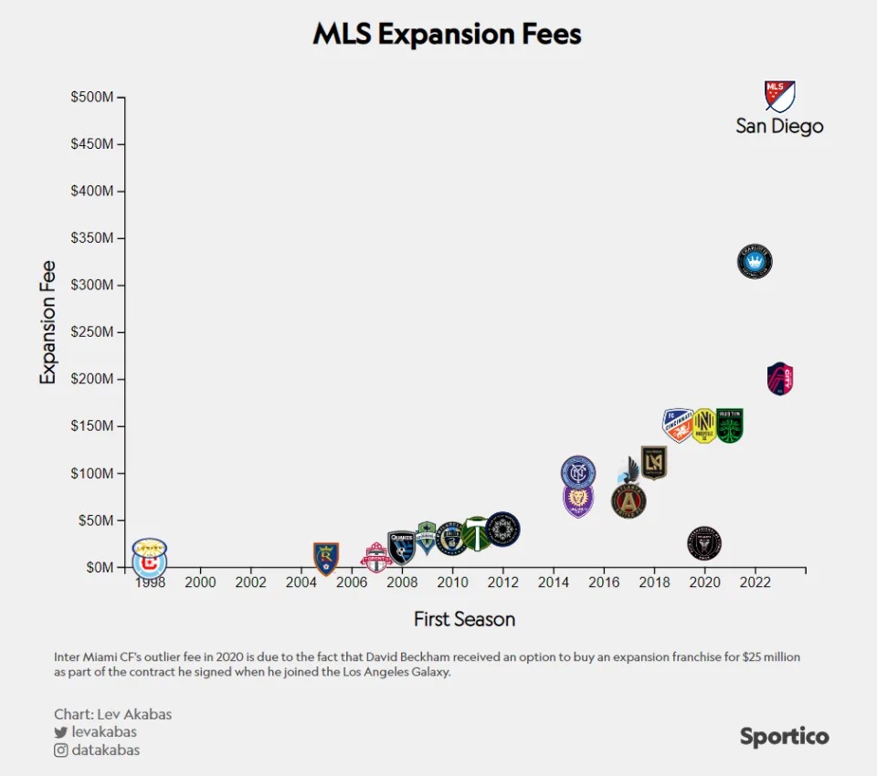 وأوضحت أن المبلغ الأعلى كان 325 مليون دولار أمريكي لنادي شارلوت في عام 2019، ليكون بذلك النادي الجديد هو الأغلى في تاريخ الدوري الأمريكي.