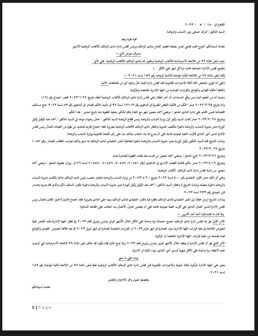 وطلب عباس في شكواه بأنه بناء على ما سبق فإنه يطالب الجهة الإدارية باتخاذ شؤنها وإجراءاتها القانونية تجاه مجلس إدارة نادي الزمالك، طبقا لنص المادة 97 من اللائحة المالية الموحدة رقم 159 لسنة 2021.