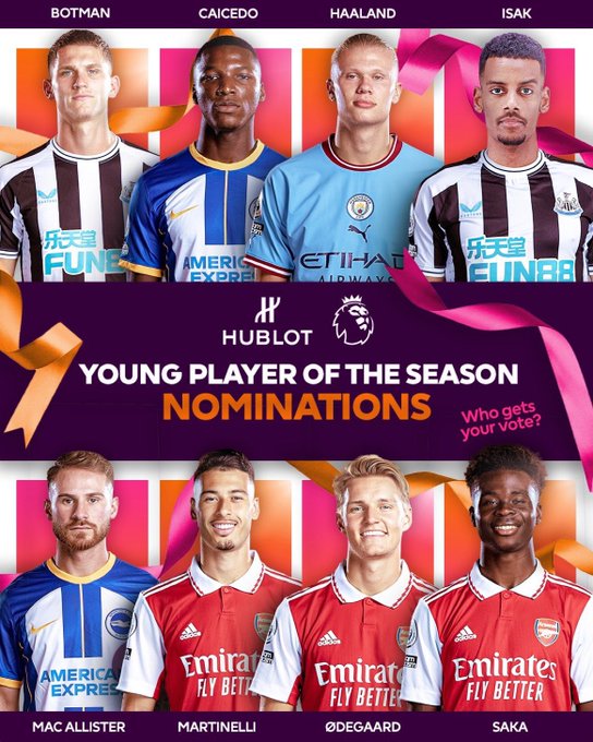 وتصدر النرويجي إيرلينج هالاند نجم مانشستر سيتي، قائمة 8 لاعبين مرشحين لنيل جائزة أفضل لاعب شاب في بطولة الدوري الإنجليزي، وهم: