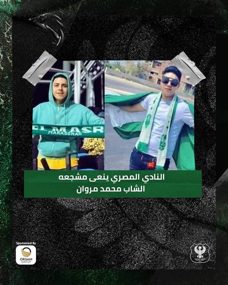 ونشر الحساب الرسمي للنادي المصري عبر موقع التواصل الاجتماعي "فيسبوك" صورة للمشجع الراحل وعلق: "مجلس إدارة النادي المصري، والأجهزة الفنية والإدارية واللاعبون والعاملون، ينعون بخالص الحزن والأسى، مشجع النادي المصري، محمد مروان، والذي وافته المنية صباح اليوم إثر حادث أليم، داعين المولى عز وجل أن يتغمد الفقيد بواسع رحمته وأن يسكنه فسيح جناته وأن يلهم أهله وذويه الصبر والسلوان وإنا لله وإنا إليه راجعون".