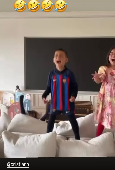 ظهر الطفل "ماتيو"، ابن النجم البرتغالي كريستيانو رونالدو، لاعب نادي النصر السعودي، وهو يرتدي طاقم برشلونة الإسباني كاملا، خلال غنائه رفقة شقيقاته في فيديو جديد.
