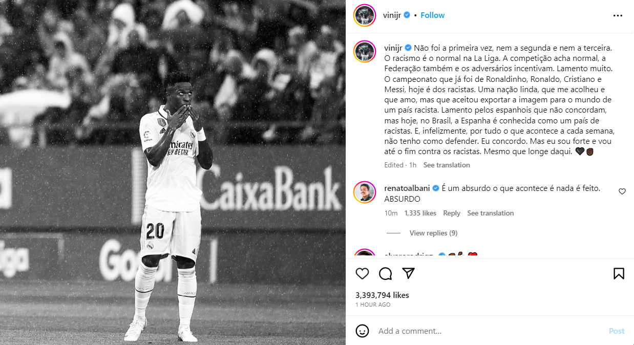 وأتم فينيسيوس رسائله القاسية بقوله: "لسوء الحظ ليس لدي دفاع عن كل ما يحدث كل أسبوع، أنا موافق ولكنني قوي وسأذهب حتى النهاية ضد العنصريين، حتى لو كان بعيدًا عن هنا".