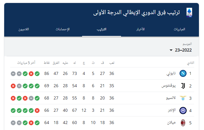 ترتيب الدوري الإيطالي للموسم الحالي 2022-2023