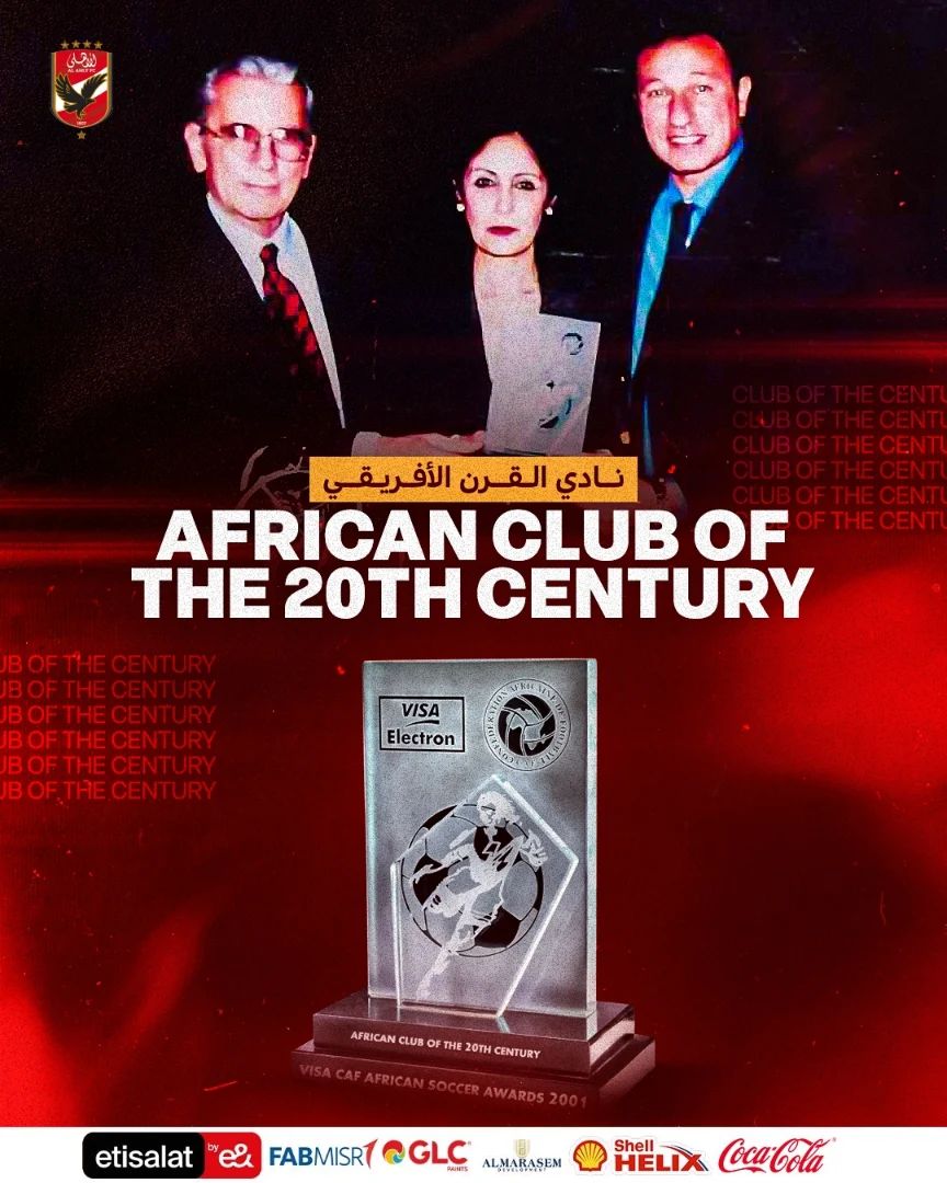 حيث كتب الحساب الرسمي للنادي الأهلي المصري على موقع "فيسبوك"، الآتي:"في مثل هذا اليوم عام 2001.. الأهلي يتسلم جائزة نادي القرن في افريقيا في حفل ضخم بمدينة جوهانسبرج".