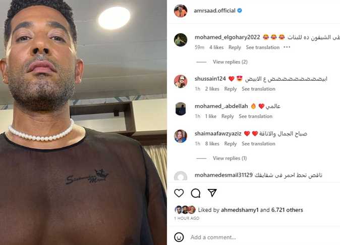 ومنذ أيام نشر الفنان عمرو سعد، صورة يرتدي فيها «تي شيرت» شفاف من قماش الشيفون، وذلك أثناء تواجده في دبي، ظاهرًا التاتو الموجود على صدره، كما ارتدى عقد في رقبته من الؤلؤ.