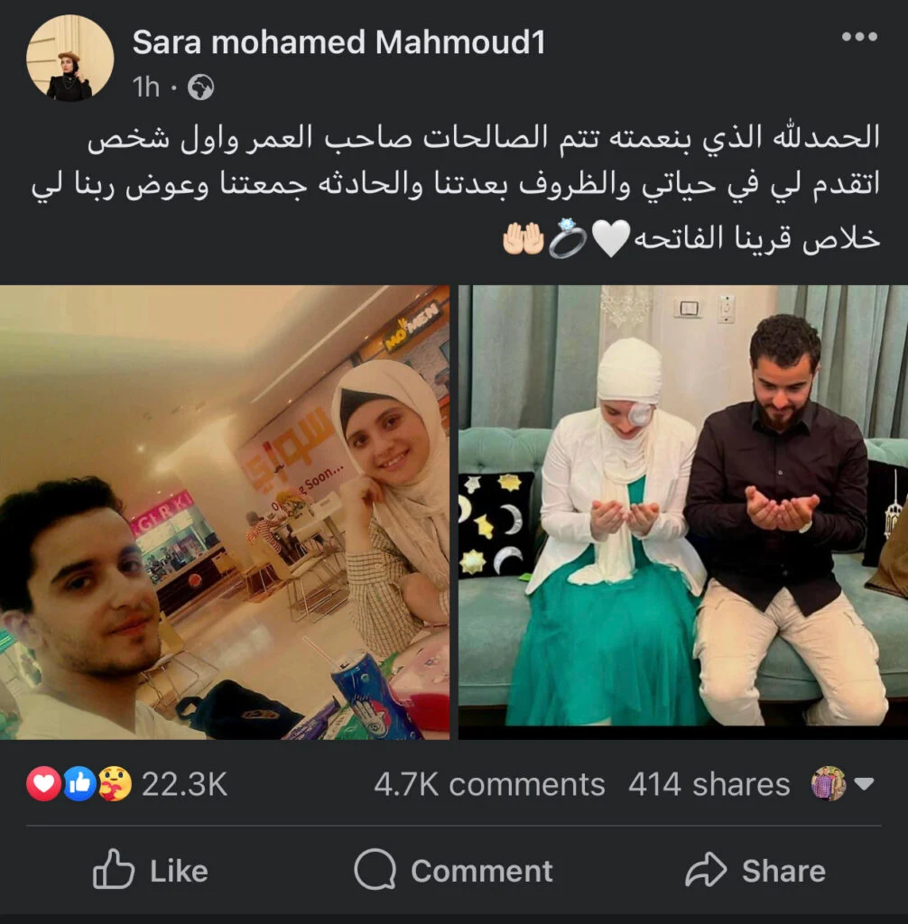 جاءت الخطوبة بعد أيام من نشر البلوجر سارة، فيديو يوثق تركيبها عين صناعية، مكان عينها التي دمرت، نتيجة الحادث الذي تعرضت له مع خطيبها السابق.