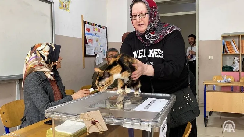 حيث خطفت امرأة مسنة مرفوقة بقطتها الأنظار، خلال جولة الإعادة بالانتخابات الرئاسية التركية ونشرت وكالة "الأناضول" التركية للأنباء صورة المرأة التي أدلت بصوتها، فيما كانت قطتها تقف على صندوق الاقتراع، وكأنها تترقب هي الأخرى نتائج الانتخابات الرئاسية، مما جعل البعض يصفها بـ "القطة الناخبة".