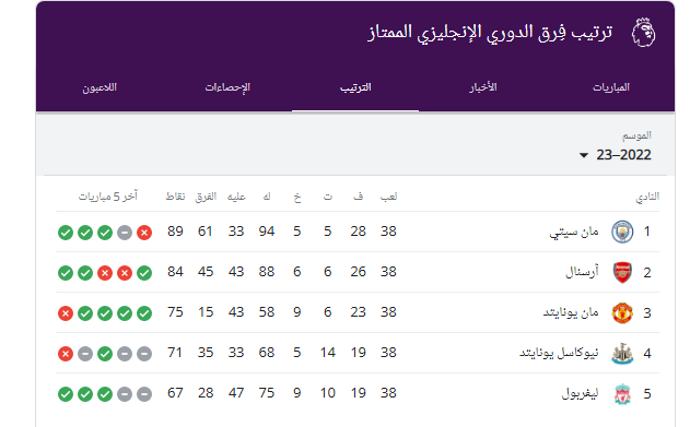 توج فريق مانشستر سيتي بلقب الدوري الإنجليزي الممتاز "بريميرليج" 2022-2023، بعد أن انفرد بصدارة الترتيب برصيد 87 نقطة.
