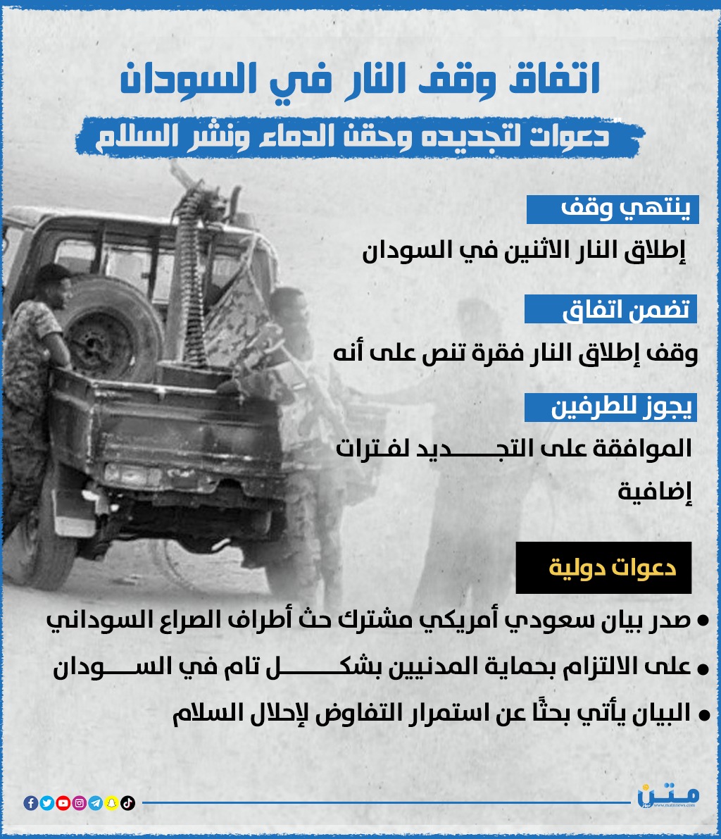اتفاق وقف إطلاق النار في السودان.. دعوات لتجديده وحقن الدماء ونشر السلام (انفوجراف)
