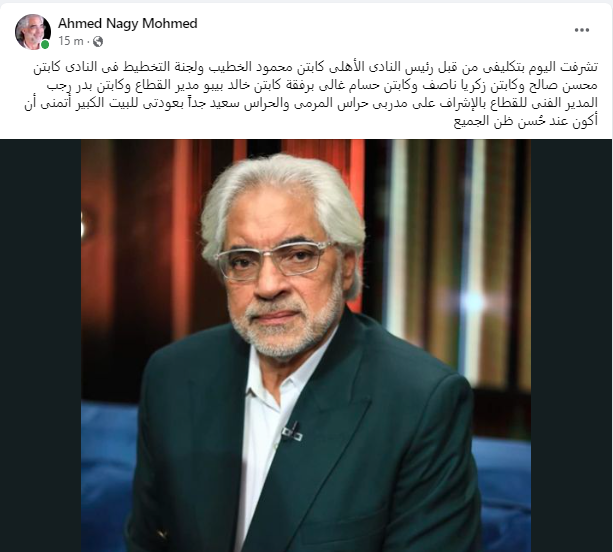 وكتب أحمد ناجي، عبر حسابه الشخصي على "فيس بوك": "تشرفت اليوم بتكليفي من قبل رئيس النادي الأهلي محمود الخطيب ولجنة التخطيط في النادي محسن صالح وزكريا ناصف وحسام غالي، برفقة خالد بيبو مدير القطاع وبدر رجب المدير الفني للقطاع، بالإشراف على مدربي حراس المرمى والحراس، سعيد جدا بعودتي للبيت الكبير، أتمنى أن أكون عند حُسن ظن الجميع".