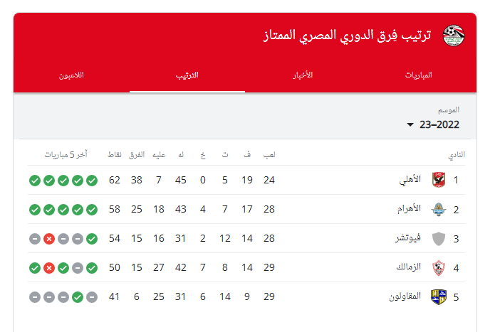 جدول ترتيب الدوري المصري 2023 بعد فوز الزمالك على طلائع الجيش