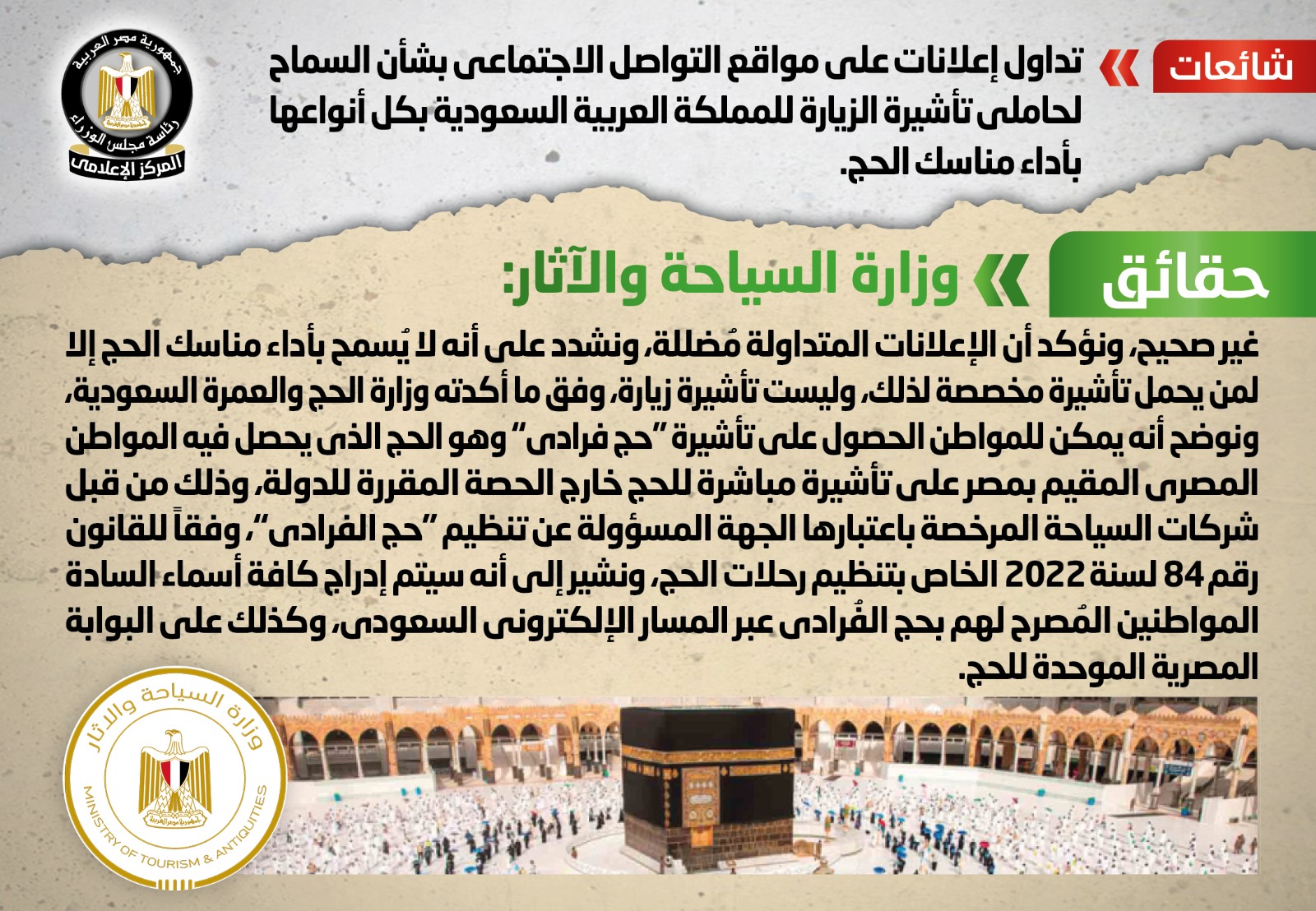 كشف المركز الإعلامي لمجلس الوزراء المصري إنه في ضوء ما تم تداوله على صفحات التواصل الاجتماعي من إعلانات بشأن السماح لحاملي تأشيرة الزيارة للمملكة العربية السعودية بكل أنواعها بأداء مناسك الحج.