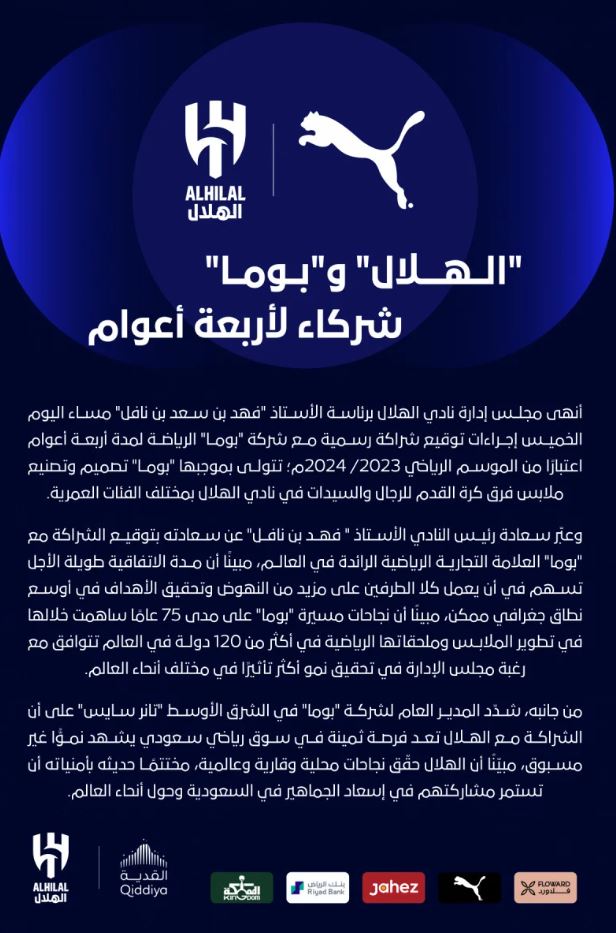 نادي الهلال السعودي يُعلن تعاقده مع شركة "بوما"